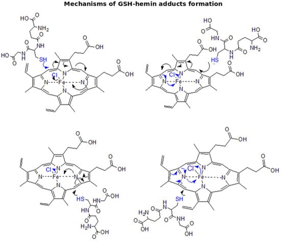 The reaction of GSH with hemin yielded the newly characterized GSH–hemin adducts, as well as their hydroxy and keto derivatives. Based on these products, we were able to delineate the chemical mechanism of the reaction between GSH and hemin (Figure 4, Figure 5 and Figure 6). Moreover, the weakening of iron bonding to hydroxy–GSH–hemin and keto–GSH–hemin adducts can explain the loss of iron and structural deterioration of hemin, caused by GSH [31].