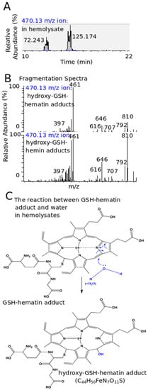 Identification of the 470.13 m/z ion corresponding to the hydroxy–GSH–hemin/hematin adducts in hemolysates of human RBCs. (A) Ion spectra of the 470.13 m/z ion, corresponding to hydroxy-GSH–hemin/hematin adducts at hemolysates (prepared as described at Figure 7A). The quantification of the ion peaks is also shown. (B) Paired comparison of MS2 spectra of the 470.13 m/z ion detected at the hemolysates and found in the in vitro reaction between GSH and hemin. (C) The mechanism of hydroxy–GSH–hematin adducts formation (one isomer is shown).