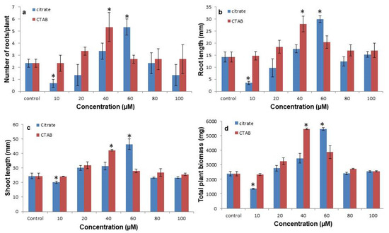 3.2. Citrate-AuNPs and CTAB-AuNPs Improves the Shoot and Root Proliferation and Biomass