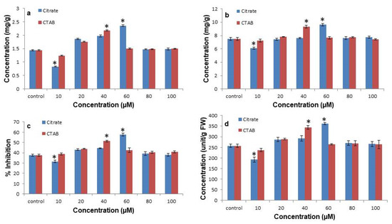 - Fazal, H.; Abbasi, B.H.; Ahmad, N.; Ali, M. Elicitation of medicinally important antioxidant secondary metabolites with silver and gold nanoparticles in callus cultures of Prunella vulgaris L. Appl. Biochem. Biotechnol. 2016, 180, 1076–1092. [Google Scholar] [CrossRef]