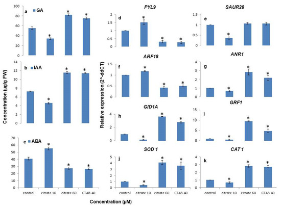 3.6. Citrate-AuNPs and CTAB-AuNPs Modulates Genes Regulating Hormone Content and Antioxidant Enzyme Activities