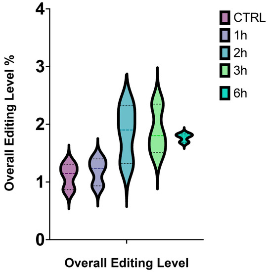 Altogether, we observed that the overall editing level reached the highest value after 3 h from A2E treatment, while the lowest after 6 h (Figure 2).