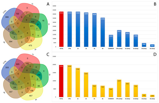 After filtering low-quality reads and adapter sequences and by applying strict filters to exclude false positives, we covered a total of 62,880 already annotated and de novo RNA editing sites among the samples, distributed in about 3000 genes (Figure 3A,C). A wide, uniform distribution of the identified RNA editing sites was observed among chromosomes, with chromosome 19 containing the greatest number of RNA editing sites, followed by chromosomes 16, 18 and 19 (Tables S2 and S3). The number and frequency of RNA editing varied between treated samples at considered time points. In total, 20,357 RNA editing sites, within 380 genes, were shared by control and all time points related treated RPE cells. Then, 31,324 RNA editing sites were found only in the control samples, 6637 were found only in RPE cell samples after 3 h of treatment, and 4562 were detected only in RPE cells after 6 h from A2E exposure (Figure 3B,D).