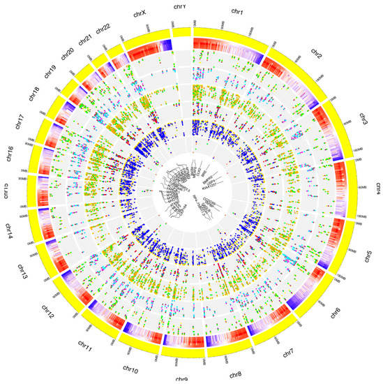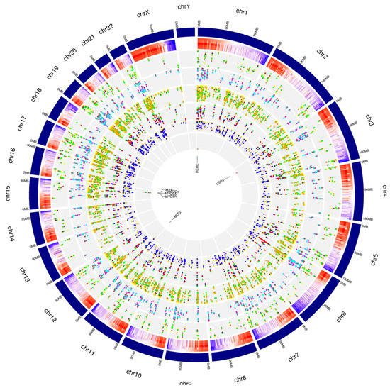 Distribution of known RNA editing sites from RPE cells across human chromosomes. The human genome is shown as a circle. For each chromosome, the position of the editing sites along with their average editing ratio (heatmap) is shown for different time points. From outside to inside: (1) N° of A-to-I only editing sites common to all considered time points and controls. The red, blue, orange, yellow and green dots indicate CTRL, 1 h, 2 h, 3 h and 6 h time points, respectively. (2) N° of C-to-U only editing sites common to all considered time points and controls. The purple, green, maroon, magenta and cyan dots indicate CTRL, 1 h, 2 h, 3 h and 6 h time points, respectively. (3) N° of editing sites within other-than-CDS and UTRs common to all considered time points and controls. The coral, navy, yellow, green and orange dots indicate CTRL, 1 h, 2 h, 3 h and 6 h time points, respectively. (4) N° of editing sites within CDS common to all considered time points and controls. The yellow, salmon, green, blue and red dots indicate CTRL, 1 h, 2 h, 3 h and 6 h time points, respectively. (5) N° of editing sites within UTRs common to all considered time points and controls. The green, orange, gold, pink and blue dots indicate CTRL, 1 h, 2 h, 3 h and 6 h time points, respectively. (6) N° of editing sites within repetitive elements common to all considered time points and controls. The yellow, red, blue, green and salmon dots indicate CTRL, 1 h, 2 h, 3 h and 6 h time points, respectively. For these editing sites, the related gene names are indicated.