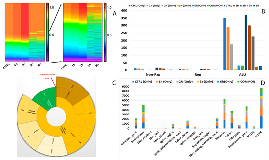 One of the most interesting aspects related to RNA editing deals with its role in coding regions as a cause of non-synonymous shifts. The most non-synonymous events involved the same sites for all considered time points, with the highest percentage reached after the first 3 h of treatment (Figure 4C).