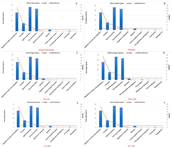 Like miRNA binding site single nucleotide polymorphisms (SNPs), RNA editing sites within miRNA binding sites may impact interactions between miRNA and target RNA. Approximately 19% between known and de novo RNA editing sites were located within 3′ UTR, which included sites common to all time points that were predicted to change the binding capacity of 359 miRNAs towards 9654 target genes. In detail, a global decrease in edited miRNA binding sites was seen, as well as their related targets (n° miRNA edited binding sitesCTRL = 354, n° target genesCTRL = 9653, n° miRNA edited binding sites3h = 298, n° target genes3h = 9444, n° miRNA edited binding sites6h = 280, n° target genes6h = 9330). According to enrichment analysis, the impacted target genes were mainly involved in signal transduction (22.5%), cell communication (21%), regulation of nucleic acid metabolism (18%), transport (7.5%) and apoptosis (2%) (Figure 9). Interestingly, it was shown that the Bonferroni corrected significance of the hypergeometric test generally increased from the statistical analysis involving 1h-related miRNA target genes to the 6h-related miRNA target genes involved in previously described pathways. More details are available in Table S5.