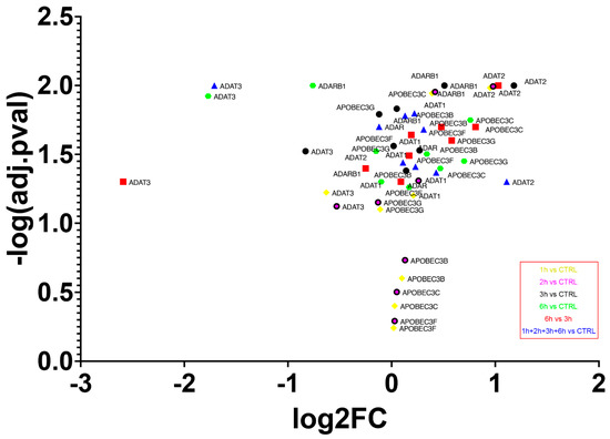 Expression of deaminase genes across A2E treatment. The volcano plot shows expression differences (FC) between different time points of deaminase encoding genes. All FCs for those genes were statistically significant (p-value ≤ 0.05).