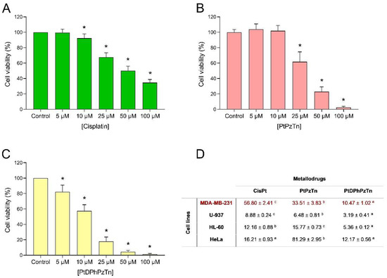 Dose–response curves of metallodrugs on cell viability. MDA-MB-231 cells were treated for 24 h with increasing concentrations (0–100 μM, as indicated) of cisplatin (A), the platinum(II) complexes PtPzTn (B) and PtDPhPzTn (C), or the vehicle (DMF, control). Data represent means ± S.D. of 6 independent experiments and are expressed as percentage of control values. * p < 0.05 compared to their corresponding control values (Dunnett’s test). (D) IC50 values (mean ± S.D., μM) of cisplatin (CisPt), PtPzTn, and PtDPhPzTn against MDA-MB-231, U-937, HL-60, and HeLa cell lines. Within each row, values followed by a diverse lowercase letter (a–c) are significantly different (p < 0.05; Tukey’s test).