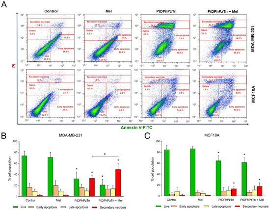 Combinatory treatment of PtDPhPzTn and melatonin differentially affects apoptosis of MDA-MB-231 and MCF10A cell lines. Cells were treated with 10.4 µM PtDPhPzTn in the presence or absence of 1 mM melatonin (Mel), or the vehicle (DMF/DMSO, control) for 24 h. (A) Representative cytograms depicting the redistribution of phosphatidylserine (annexin V-FITC staining) in the presence of propidium iodide (PI) after challenging cells with the indicated drugs. Histogram bars show percentages of live, early apoptotic, late apoptotic, and secondary necrotic MDA-MB-231 (B) and MCF10A (C) cells. Values represent means ± S.D. of 5 independent experiments. * p < 0.05 compared to control values (Dunnett’s test). # p < 0.05 compared to PtDPhPzTn-treated cells (Tukey’s test).