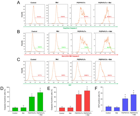 Caspase activation and reactive oxygen species (ROS) production triggered by combinatory treatment of PtDPhPzTn and melatonin in MDA-MB-231 cells. Cells were treated with 10.4 µM PtDPhPzTn in the presence or absence of 1 mM melatonin (Mel), or the vehicle (DMF/DMSO, control) for 24 h (except for ROS production, wherein cells were challenged for 4 h). Representative cytograms show caspase-3 (A) and -9 (B) activation as well as ROS production (C) after challenging cells with the indicated drugs. Histogram bars represent percentages of caspase-3-positive (D), caspase-9-positive (E), and DCF-stained (F) MDA-MB-231 cells, which were analyzed by flow cytometry (for details, see Section 2.6 and Section 2.7). Values are presented as means ± SD of four independent experiments. * p < 0.05 compared to control values (Dunnett’s test).