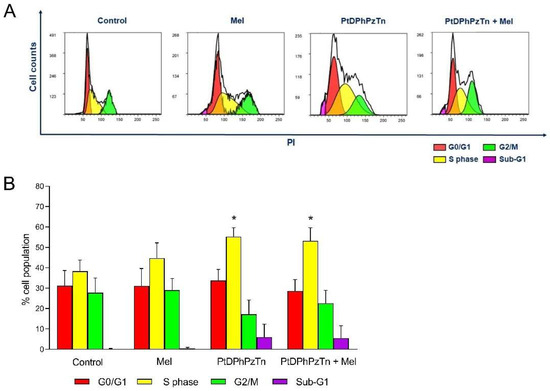Combinatory treatment of PtDPhPzTn and melatonin disturbed cell cycle profile of MDA-MB-231 cell line. Cells were treated with 10.4 µM PtDPhPzTn in the presence or absence of 1 mM melatonin (Mel) or the vehicle (DMF/DMSO, control) for 24 h. (A) Representative cytograms displaying cell cycle distribution after challenging cells with the indicated drugs. (B) Histogram bars show percentages of cells in G0/G1 transition, S phase, G2/M transition and sub-G1 population (hypodiploid cells). Values represent means ± S.D. of 5 independent experiments. * p < 0.05 compared to control values (Dunnett’s test).