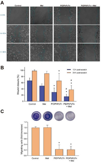 Combinatory treatment of PtDPhPzTn and melatonin altered migration properties of MDA-MB-231 cell line. Cells were treated with 10.4 µM PtDPhPzTn in the presence or absence of 1 mM melatonin (Mel) or the vehicle (DMF/DMSO, control) for 24 h. (A) Representative images depicting wound-healing assay in cells challenged with the indicated drugs. (B) Histogram bars show the percentage of wound closure after 12 and 24 h, where 100% represents a fully closed wound. Values represent means ± S.D. of 12 independent experiments. (C) Proportion of migrating cells after 24 h of exposure to the indicated drugs determined by transwell migration assay (for details, see Section 2.10). Representative images of transwell inserts for each condition are depicted in the upper part. Data represent means ± S.D. of 5 independent experiments and are expressed as fold-increase of control values. * p < 0.05 compared to its corresponding control value (Dunnett’s test). # p < 0.05 compared to its corresponding PtDPhPzTn value (Tukey’s test).