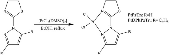 To perform the synthesis (Scheme 1), (300.0 mg, 0.71 mmol) the [PtCl2(DMSO)2] precursor was dissolved in 30 mL of ethanol in an Elenmeyer flask. On the other hand, the ligand was dissolved in 20 mL of ethanol. Once dissolved, the ligand corresponding was added to the precursor and it was refluxed and stirred for 24 h in the dark. The powder formed was vacuum filtered off and then recrystallized in DMF (for PtPzTn) or acetonitrile (for PtDPhPzTn). After that, crystals were separated by filtration, washed with distilled water and cold diethyl ether, and air-dried.