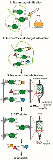 Procedure for isolation of in vivo Trx interactors. His-tagged single-cysteine mutants of Trx f, Trx m and NTRC were separately agroinfiltrated into N. benthamiana plants (1 and 2). After 5 days, leaf protein extraction was performed and the Trxs, along with their interactors, were captured in a column packed with Ni-NTA agarose (3). Finally, redox interactors were eluted with DTT (5). Trx mut: thioredoxin mutant; DTT: dithiothreitol.