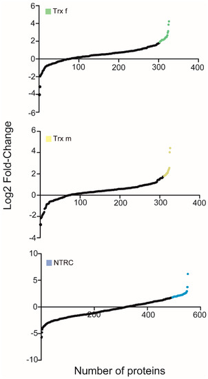 Proteomic analysis of the Trx-interacting proteins. Using quantitative mass spectrometry, eluted Trxs proteomes were compared to the control (empty-vector proteome). The candidate proteins are separately shown for Trx f (green), Trx m (yellow) and NTRC (blue).