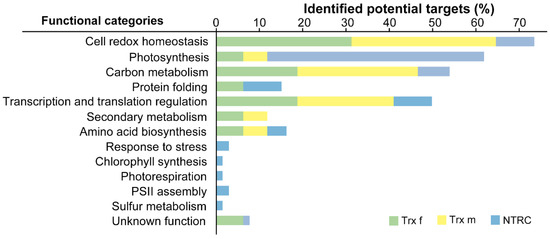 Functional classification of proteins identified as putative Trx f, Trx m or NTRC partners in chloroplasts. The plot represents the percentage of total targets for each Trx in each functional category.