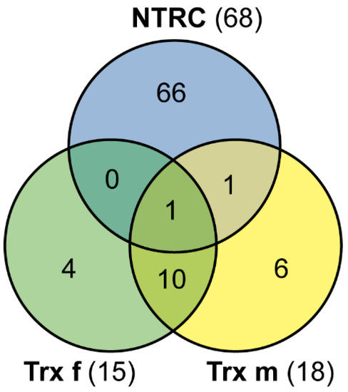 Comparison of Trx specificity. Venn diagram representation showing the overlap between candidate target proteins for Trx f, Trx m and NTRC.