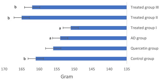 Body weight in different studied groups. a: Significant difference at p < 0.05. compared to the control group. b: Significant difference at p < 0.05 compared to AD group.