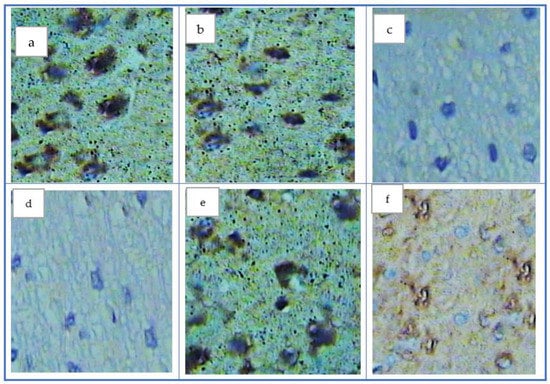 Evaluation of immune histochemical results of both the control and QC groups showed a positive reaction of COX-1, as demonstrated by the presence of a brown color (Figure 3a,b), while a negative reaction of COX-1 in the AD group appeared in the absence of a brown color (Figure 2c). In addition, treated group I showed a negative reaction—i.e., absence of the brown color (Figure 3d). Contrarily, treated group II that received QC showed a positive reaction of COX-1 as shown by a faint brown color (Figure 3e), whereas treated group III, which received QCNE, showed a strong positive reaction of COX-1 as shown by brown color which appeared more or less closed to the control group (Figure 3f).