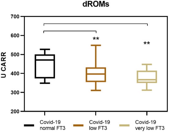 In COVID-19 patients with NTIS, we observed a reduced generation of ROS compared to COVID-19 patients without NTIS (Figure 1). In particular, those with very low levels of serum FT3 (≤1.0 pg/mL) showed significantly lower medium levels of dROMs (376.5 U CARR) compared to those with moderately low FT3 serum levels (>1.0 ≤1.7 pg/mL) that showed higher medium levels of dROMs (395 U CARR). The difference was still remarkable when dROMs values were considered in these two groups of patients combined (all with FT3 serum levels ≤ 1.7 pg/mL) and were compared to those obtained in COVID-19 patients with normal FT3 serum levels (>1.8 pg/mL). These patients showed the highest medium dROMs values observed (449.5 U CARR) (Table 3). These results indicate that the generation of ROS is dependent on the presence of FT3.