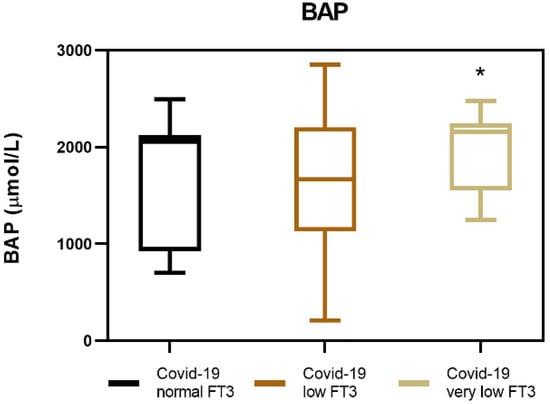 Since THs are known to have effects on both oxidation and antioxidation processes, we tested the serum of our COVID-19 patients for their ability to reduce Fe3+ ions to Fe2+ ferrous ions in the BAP test. The results of the BAP test indicate that COVID-19 patients with NTIS, and especially those that have very low FT3 serum levels, have a higher medium antioxidant potential (2068.4 µmol/L) when compared to COVID-19 patients that do not have NTIS (1605.4 µmol/L) (Figure 2, Table 3).