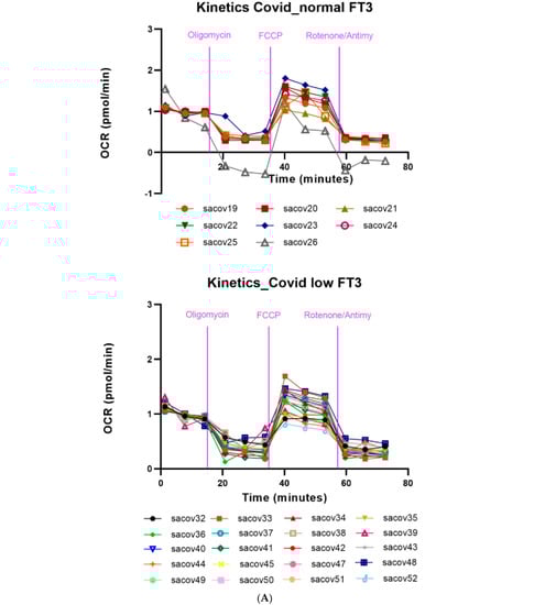 These results confirm those obtained in our cohort of COVID-19 patients and reinforce the role of T3 in regulating mitochondrial respiration and, in particular, in stimulating both the maximal respiratory capacities and proton leak.