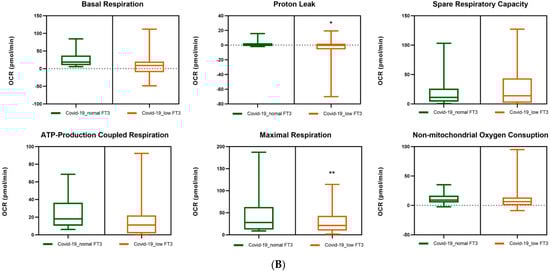 In particular, the PBMCs obtained from COVID-19 patients showed a reduction in all parameters of mitochondrial respiration, examined by Seahorse, with a remarkable reduction in both basal and maximal respiration capacity. We then evaluated the effects of the reduced levels of serum FT3 in the PBMCs obtained from our cohort of COVID-19 patients, divided between those that presented low FT3 serum levels (≤1.7 pg/mL) and those that showed normal FT3 serum levels (>1.8 pg/mL). No significant differences were observed in the two groups of PBMC samples with regards to basal respiration, ATP-linked respiration, spare capacity, and non-mitochondrial oxygen consumption. PBMCs of COVID-19 patients with low FT3 showed a significant reduction in the medium values of maximal mitochondrial respiration and in the proton leak, compared to those with normal FT3 (Figure 3A,B).