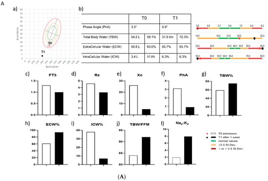 Patient 1, at admission (T0), had a BMI of 26, a SOFA score of 5, and low FT3 serum levels (1.3 pg/mL), associated with low TSH serum levels (0.16 µIU/mL). After one week (T1), FT3 dropped rapidly, and it was measured at a very low level (less than 1.0 pg/mL) (Table 2). All BIA parameters, including Rz, Xc, PhA, TBW%, ECW%, ICW%, TBW/FFM, and the Nae:Ke ratio dramatically worsened (Figure 4A). In particular, Rz, Xc, and PhA, were significantly reduced, while TBW%, ECW%, and the TBW/FFM ratio were increased. The ICW% dropped dramatically. Finally, the Nae:Ke ratio showed a seven-fold increase compared to the level registered at time T0 (Figure 4A). The patient died after a few days.