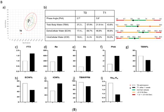 Patient 2, at admission (T0), had a BMI of 29.4, a SOFA score of 2, and a very low FT3 serum level (<1.0 pg/mL), associated with low TSH serum levels (0.39 µIU/mL) (Table 2). This patient received treatment with oral LT3 (Liotir, IBSA, 1 drop = 0.71 µg) for one week at a dosage of 30 drops (equal to 21.3 µg) TID, for a total of 63.9 µg/die. BIA parameters, including Rz, Xc, PhA, TBW%, ECW%, ICW%, TBW/FFM, and the Nae:Ke ratio dramatically improved and returned to normal values (Figure 4B). In particular, the Rz, Xc, and PhA, were all increased, the TBW%, the ECW%, and the TBW/FFM ratio were reduced, the ICW% showed a near two-fold increase, and the Nae:Ke ratio showed a three-fold reduction, compared to the level registered at time T0. The patient continued receiving LT3 treatment until she was dismissed by the hospital.