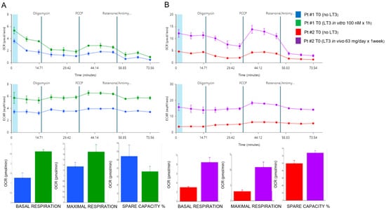 Mitochondrial respiration in two COVID-19 patients in the pilot study. Seahorse analysis of oxygen consumption rate (OCR) and extracellular acidification rate (ECAR) performed on PBMCs obtained from COVID-19 patients with NTIS and treated in vivo and in vitro with LT3. (A) The analysis of the PBMCs from patient 1 before (in blue) and after (in green) in vitro treatment with 100 nM of LT3 for 1 h. The profiles of oxygen consumption and extracellular acidification rates are reported in the upper panels; the graphs showing basal and maximal OCR and spare capacity are reported in the lower panels. (B) The analysis of the PBMCs from patient 2 before (in red) and after (in purple) in vivo treatment with 63.9 µg/die of LT3, given orally for one week. The profiles of oxygen consumption and extracellular acidification rates are reported in the upper panels; the graphs showing basal and maximal OCR and spare capacity are reported in the lower panels. OCR was measured continuously throughout the experimental period at baseline and in the presence of the indicated drugs: 1 μM oligomycin, 1 μM FCCP, and 1 μM rotenone with 1 μM antimycin A (R + A).