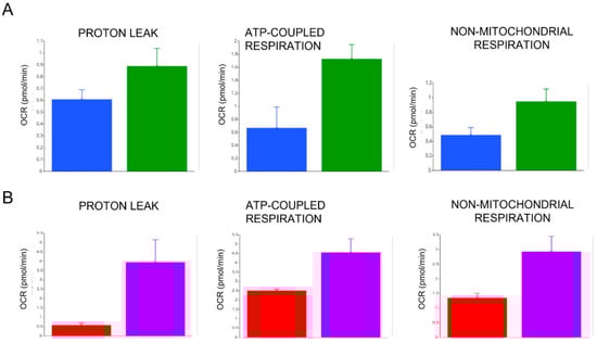 Mitochondrial respiration in two COVID-19 patients in the pilot study. Seahorse analysis of proton leak, ATP-produced respiration and non-mitochondrial respiration, performed on PBMCs obtained from COVID-19 patients with NTIS and treated in vivo and in vitro with LT3. (A) Analysis of the PBMCs from patient 1 before (in blue) and after (in green) in vitro treatment with 100 nM of LT3 for 1 h. (B) analysis of the PBMCs from patient 2 before (in red) and after (in purple) in vivo treatment with 63.9 µg/die of LT3, given orally for one week.
