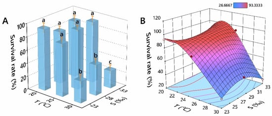 Effects of temperature and salinity on the survival rates of Perna viridis. ((A) histogram; (B) response surface plot). Different letters indicate significant differences (p < 0.05).
