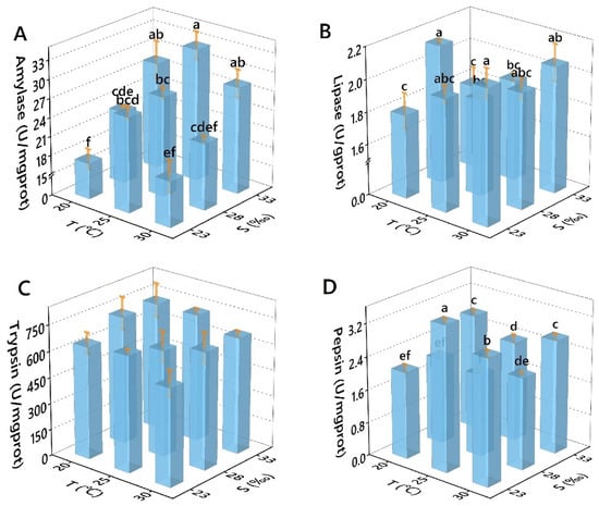 Effects of temperature and salinity on the digestive enzyme activities. ((A) Amylase, (B) Lipase; (C) Trypsin; (D): Pepsin) of Perna viridis. Different letters indicate significant differences (p < 0.05).