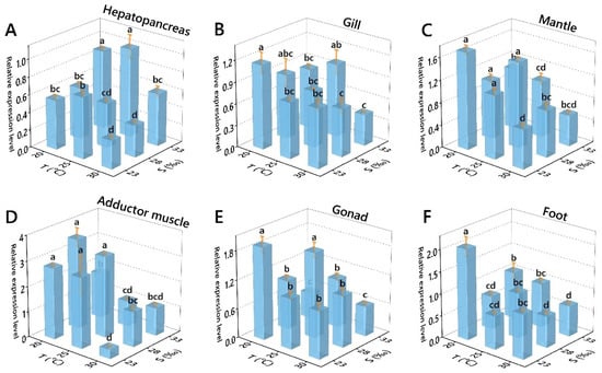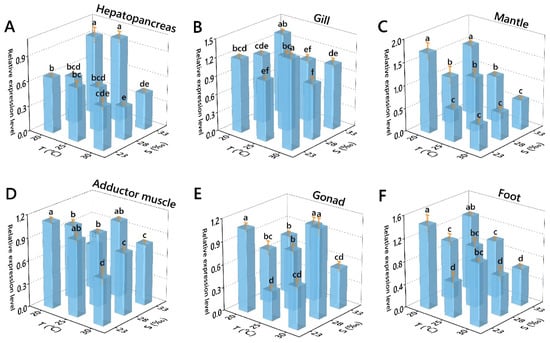Effects of temperature and salinity on the GPX relative expression level of Perna viridis in different tissues. ((A) Hepatopancrear; (B) Gill; (C) Mantle; (D) Adductor muscle; (E) Gonad; (F) Foot). Different letters indicate significant differences (p < 0.05).