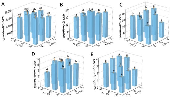 Effects of temperature and salinity on the antioxidant-related indicators. ((A) SOD; (B) GPX; (C) CAT; (D) GSH; (E) MDA) of Perna viridis. Different letters indicate significant differences (p < 0.05).