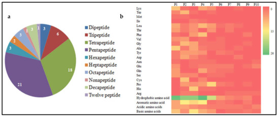 Characterization of antioxidant peptides from nut proteins. (a) The pie chart shows the proportions of the identified antioxidant peptides. The numbers on the pie chart indicate the number of each type of peptide. (b) Heat map of the frequency of amino acid residues occurring at the residues located from the first position (P1) to the tenth position (P10) of the N-terminus amino acid of the identified antioxidant peptides.