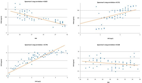 Spearman’s correlations between the levels of studied proteins and patients’ BMI and CRP levels. On the (top), figures demonstrate correlations for PON1, while on the (bottom), figures demonstrate correlations for PTX3.