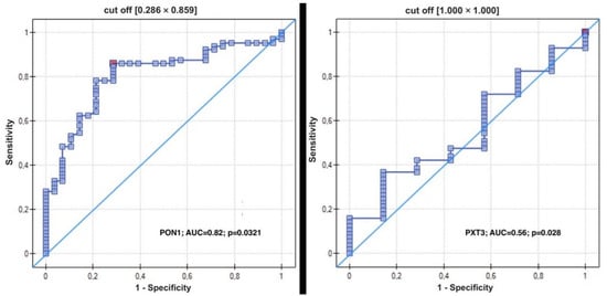 The cutoff values for PON1 and PTX3 that were elevated in the serum of patients were calculated using ROC curve analysis. The analysis showed that when the serum PON1 level was 142.6 ng/mL or higher, the sensitivity and specificity were 79 and 84%, respectively (p = 0.0321). When the serum PTX3 level was 4.2 ng/mL or higher, the sensitivity was 63% and specificity was 57% (p = 0.028) (Table 6). The area under the curve (AUC) for PON1 was 0.82 and for PTX3 was 0.56. The ROC curves for PON1 and PTX3 are shown in Figure 2.
