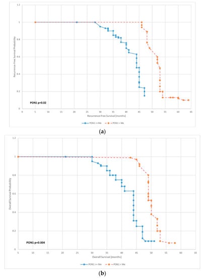 A survival analysis achieved by applying the Kaplan–Meier curve was conducted to define the utility of the proteins studied in the survival prognosis of endometrial cancer. Overall survival (OS) analysis and recurrence-free survival (RFS) analysis using Kaplan–Meier curves were conducted for PON1 median levels. RFS probability and OS probability were found to be higher for PON1 concentrations below the median (p = 0.02, p = 0.004, respectively) (Figure 3).