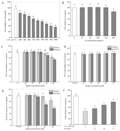 Cytotoxicity and the protective effect of SIs on CoCl2-induced cell viability loss. (A) Cytotoxicity of CoCl2. (B) Cytotoxicity of SIs. (C) Cytotoxicity of daidzin and daidzein. (D) Cytotoxicity of genistin and genistein. (E) Cytotoxicity of glycitin and glycitein. (F) The protective effect of SIs on CoCl2-induced cell viability loss. Means with different small letters were significantly different (p < 0.05).