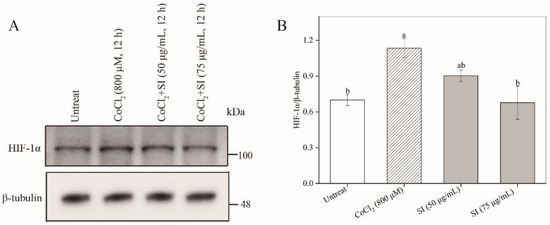 The effects of CoCl2 and SIs on the expression level of HIF-1α. (A) Western blot analysis of HIF-1α protein. (B) The relative expression level of HIF-1α protein. Means with different small letters were significantly different (p < 0.05).