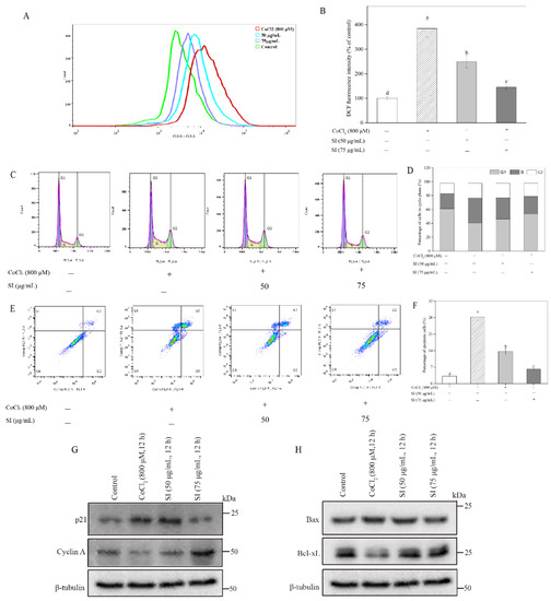 Effects of SI on ROS production, cell cycle arrest, and apoptosis induced by CoCl2. (A) ROS levels analyzed by flow cytometer. (B) Fluorescence intensity in (A). (C) Cell cycle analyzed by flow cytometer. (D) Cell cycle in (C). (E) Cell apoptosis analyzed using flow cytometer. (F) Cell apoptosis rate in (E). (G) Western blot analysis of p21 and cyclin A proteins. (H) Western blot analysis of Bax and Bcl-xL proteins. Means with different small letters were significantly different (p < 0.05).