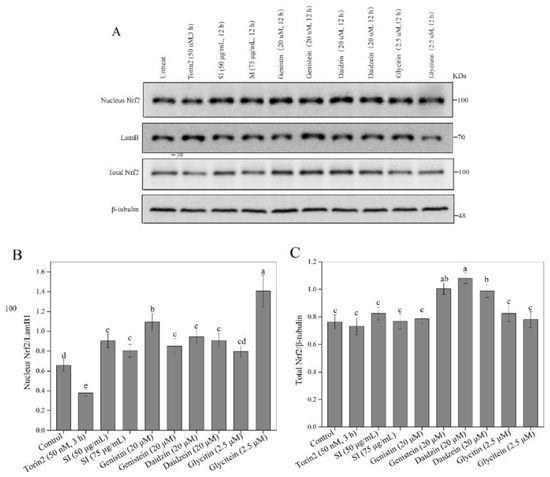 Effects of isoflavones on Nrf2 protein activation. (A) Western blot analysis of Nrf2 protein. (B) The relative expression level of nuclear Nrf2 protein. (C) The relative expression level of total Nrf2 protein. Means with different small letters were significantly different (p < 0.05).