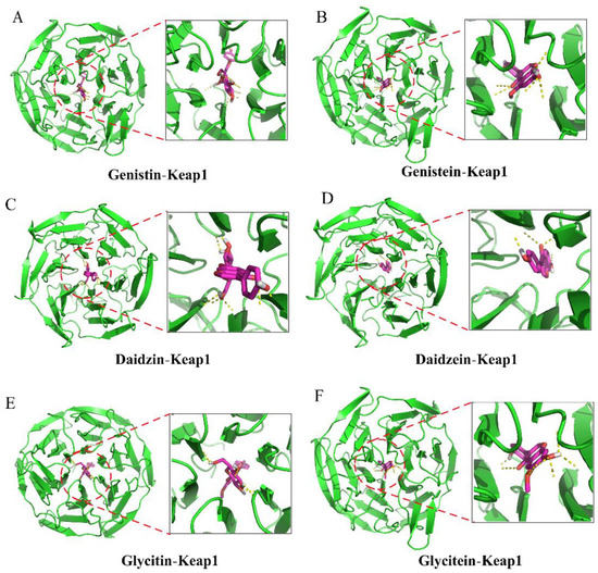 Molecular docking analysis of the interactions between isoflavones and Keap1 protein (3D diagram). (A) Genistin bound to keap1. (B) Genistein bound to keap1. (C) Daidzin bound to keap1. (D) Daidzein bound to keap1. (E) Glycitin bound to keap1. (F) Glycitein bound to keap1.