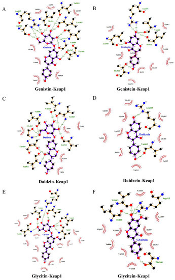 Molecular docking analysis of the interactions between isoflavones and Keap1 protein (2D diagram). (A) Genistin bound to keap1. (B) Genistein bound to keap1. (C) Daidzin bound to keap1. (D) Daidzein bound to keap1. (E) Glycitin bound to keap1. (F) Glycitein bound to keap1.