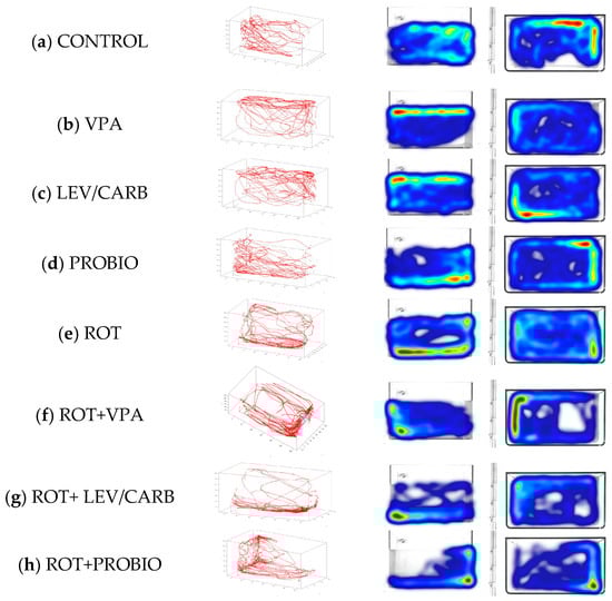As expected in the case of the four non-ROT-exposed groups (a–d), zebrafish retain their exploratory behavior throughout the entire analyzed period, with slight phenotypical changes in (b) VPA and (c) LEV/CARB defined as “reaching the surface of the water” indicating the possible neuroactive potential of these two agents, whereas in the (d) PROBIO group a behavioral pattern similar to the (a) CONTROL can be seen. On the other hand, the groups given ROT (e–h) manifest an affinity towards the bottom of the aquarium as observed in (e) ROT and (g) ROT+LEV/CARB. Moreover, the swimming patterns in (f) ROT+VPA and (h) ROT+PROBIO are antithetical in contrast with (e) ROT and (g) ROT+LEV/CARB.