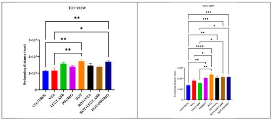 Regarding the swimming distance (mm) parameter recorded, significant differences emerge between the (a) CONTROL and several experimental groups: compared with (e) ROT, p = 0.002/p < 0.0001, and (h) ROT+PROBIO, p = 0.004/p = 0.000, according to both cameras, whereas in (d) PROBIO, p = 0.002; (f) ROT+VPA, p = 0.004; and (g) ROT+LEV/CARB, p = 0.000 based on the trials registered only by the lateral camera. Other circumstances where we noted differences were in (b) VPA compared with (e) ROT, p = 0.009/p = 0.038, also according to both cameras, and (h) ROT+PROBIO, p = 0.014, by the top camera. Additionally, the group (c) LEV/CARB exhibited differences with (e) ROT, p = 0.001; (g) ROT+LEV/CARB, p = 0.022; and (h) ROT+PROBIO, p = 0.025 (Figure 2).