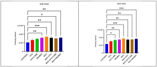 Intriguing behavioral patterns further arise following the centralization of data attributed to the velocity (mm/s) parameter in (a) CONTROL by comparison with both ROT-exposed and non-exposed groups. More specifically, the only group where we did not note a significant difference was by comparison with (b) VPA (p > 0.05) and with a particular case in (c) LEV/CARB, p = 0.024 per lateral camera. Continuing with this concept, we still found major differences between the healthy zebrafish and (d) PROBIO, p = 0.004/p = 0.004; (e) ROT, p = 0.000/p = 0.000; (f) ROT+VPA, p = 0.008/p = 0.007; (g) ROT+LEV/CARB, p = 0.019/p = 0.005; and (h) ROT+PROBIO, p = 0.003/p = 0.000, based on top and lateral camera recordings (Figure 3).