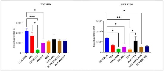 Complementary to the observations made in the light of the above two parameters, in (a) CONTROL, multiple episodes of inactivity (s) were observed by reference with (c) LEV/CARB, p = 0.000/p = 0.010, and (d) PROBIO, p = 0.031/p = 0.042 via the top and side view and between (e) ROT, p = 0.007, and (g) ROT+LEV/CARB, p = 0.036, by the lateral camera. Two sole cases in which we observed differences were in (b) VPA in contrast with (c) LEV/CARB, p = 0.013, by the vertical camera, and (e) ROT with (f) ROT+VPA, p = 0.045, by the lateral camera (Figure 4).