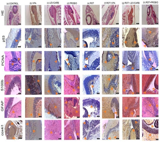 However, in groups (b) VPA, (c) LEV/CARB, and (d) PROBIO, there is a positive marking for neurogenesis (PCNA), apoptosis (p53), and the presence of mature, active radial neurons and glial cells (GFAP and S100b). Cox4i1 has positivity in these groups, which denotes intense mitochondrial activity.